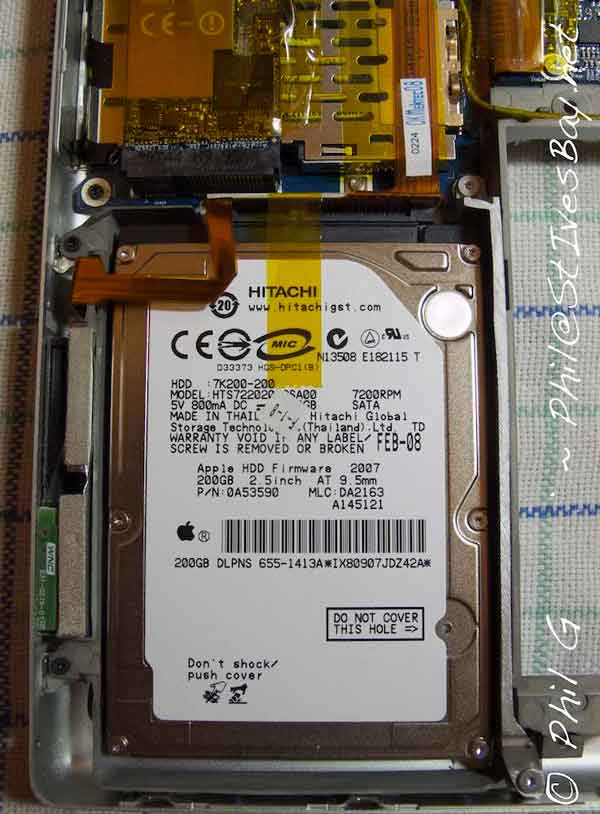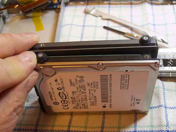 Above you can see the existing HDD in this model it is removed by first removing the clamping strip on the RH side screw heads are visible top and bottom ( bottom one just to the left of the © symbol ).